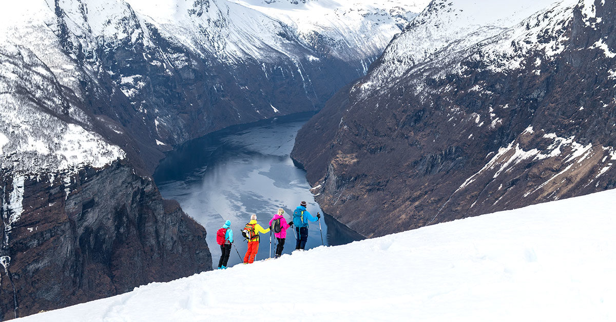 Skiers on a snowy ridge overlooking the Geirangerfjord, surrounded by steep alpine mountains and winter scenery