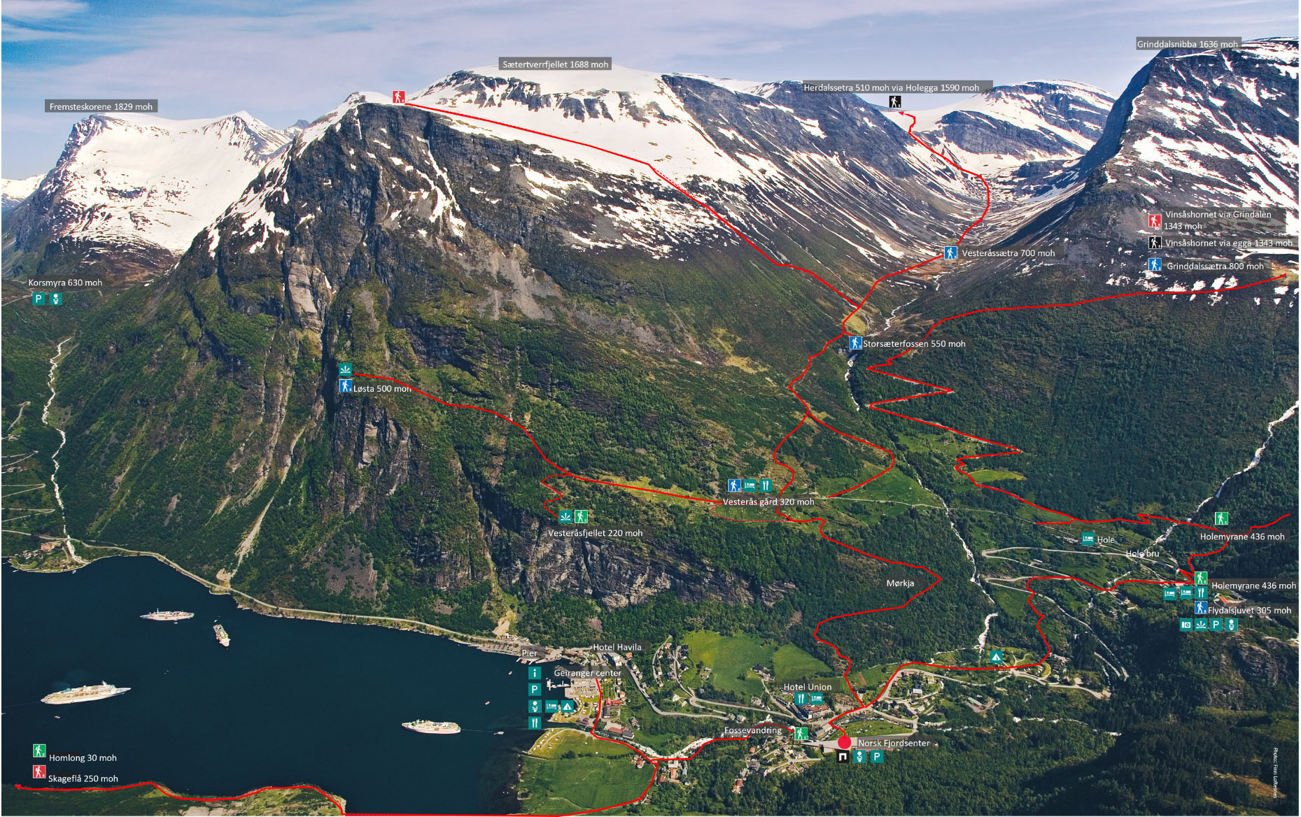 Whether you are visiting Geiranger for a few hours or several days, there are ample opportunities for things to do in Geiranger, especially hiking. At the map, you will find an overview of some of the hiking trails around Geiranger, especially suited for the summer period (late May to the end of September). Trail accessibility largely depends on weather and snow conditions, so it is always a good idea to check the accessibility before your hiking tour. Feel free to contact us for more information about the trails (post@verdsarv.no) . Weather and other conditions can vary a lot throughout the year, and in periods the risk of rock falls, and avalanches can mean that certain trails should be avoided. Show respect for the forces of nature. We are happy to advise you on safe hiking choices.
